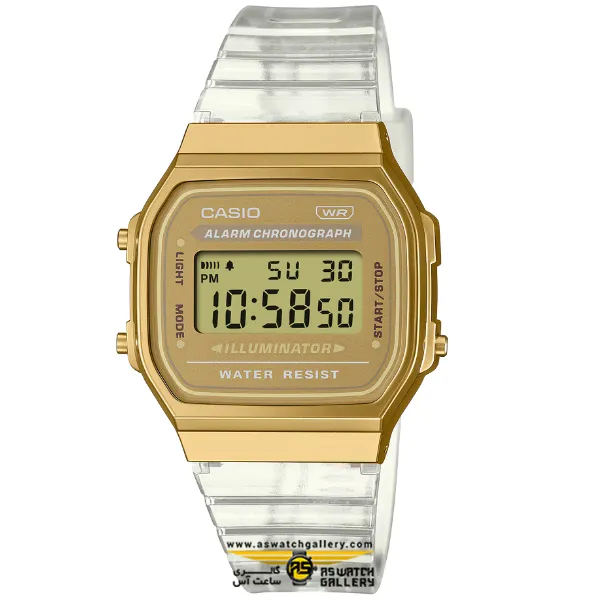 قلب تپنده این ساعت، همان قاب مربعی با گوشههای پخدار معروف سری A168 است. بدنه این مدل با رنگ طلایی شامپاینی (Champagne Gold) پوشش داده شده است که حسی از لوکس بودن را منتقل میکند. این رنگ طلایی نه آنقدر تند است که چشم را بزند و نه آنقدر کمرنگ که بیروح باشد؛ بلکه تعادلی عالی دارد که با انواع رنگ پوست هماهنگ میشود.