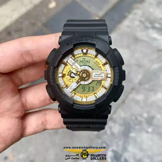 جی شاک مدل GA-110CD-1A9DR با الهام از استایل خیابانی و رنگهای متضاد طراحی شده است. صفحه ساعت با جزئیات طلایی و نقرهای، جلوهای لوکس در دل طراحی اسپرت ایجاد کرده است. ترکیب این رنگها با قاب مشکی، تعادلی میان قدرت و ظرافت به وجود آورده است، درست همان چیزی که از یک ساعت G-SHOCK انتظار دارید.