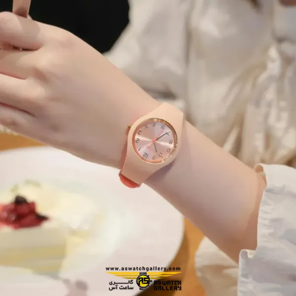 صفحه ساعت (Dial): صفحه ساعت با فینیشینگ براق (Sunray) و به رنگ هلویی متالیک طراحی شده است. این براقیت باعث میشود نور روی صفحه بازی کند و ساعت را از حالت مات و یکنواخت سیلیکونی خارج نماید. عقربهها و ایندکسها با رنگی ملایم (معمولاً رزگلد یا طلایی) دیزاین شدهاند تا هارمونی کاملی با رنگ گرم زمینه داشته باشند.